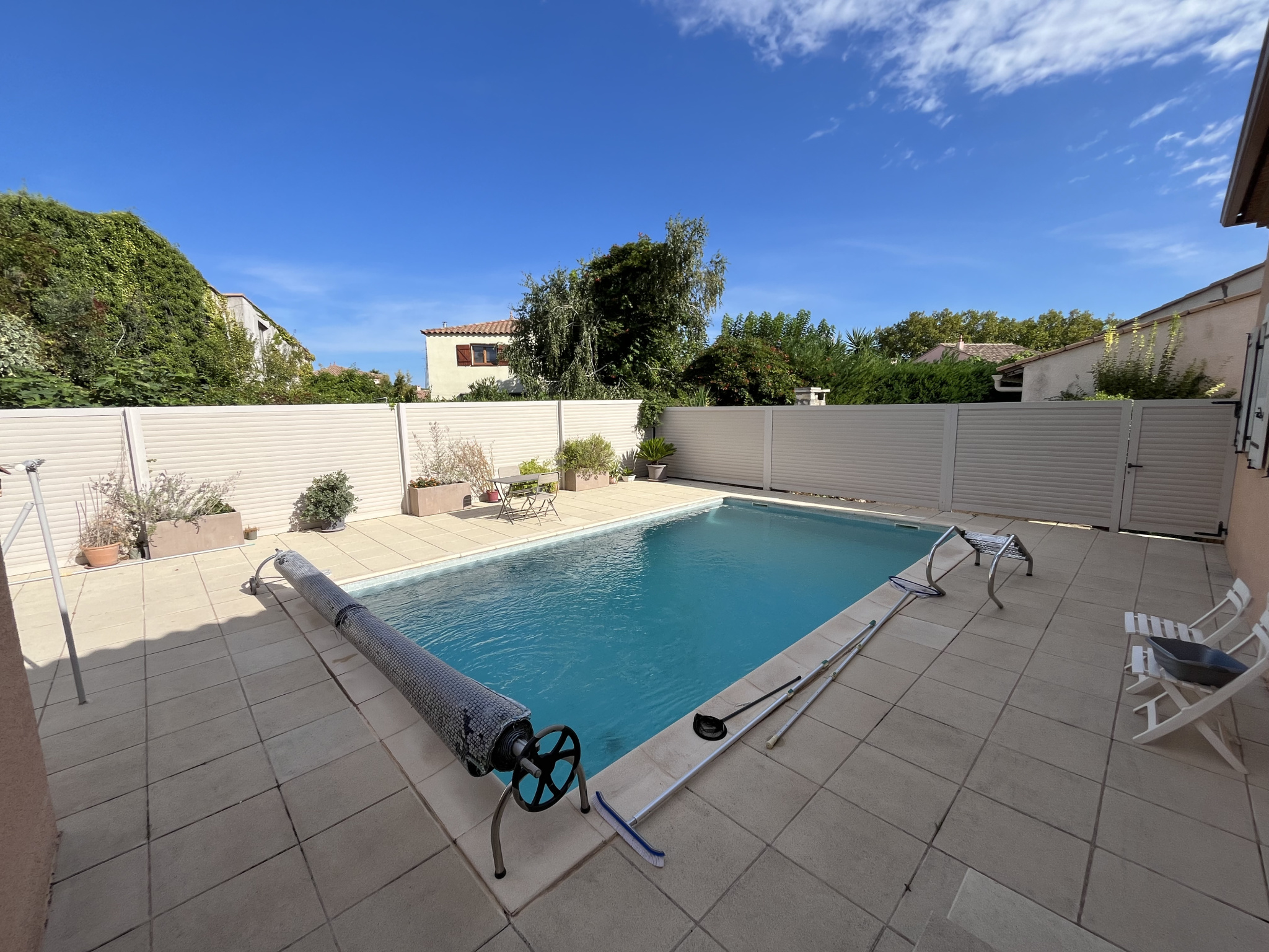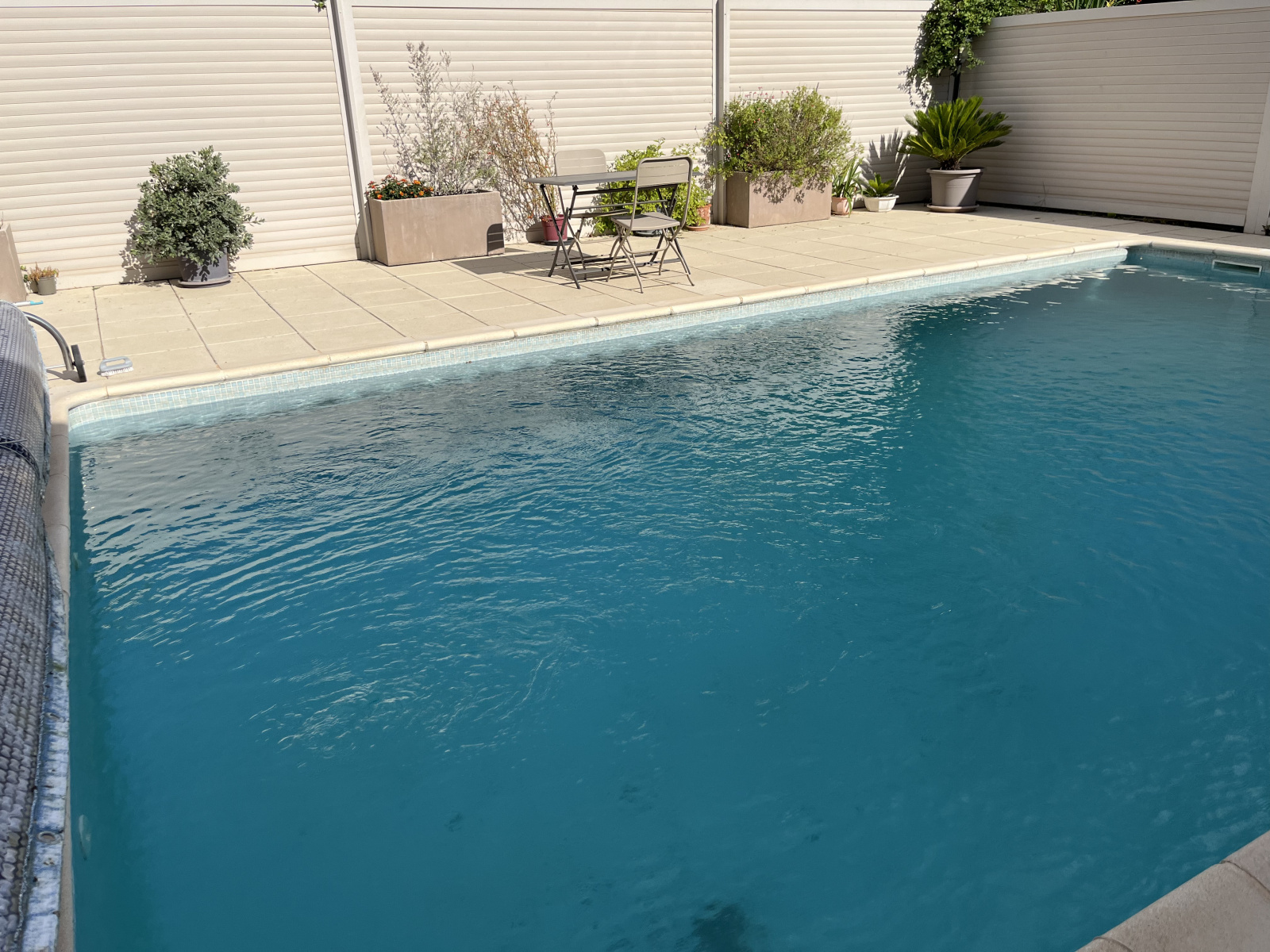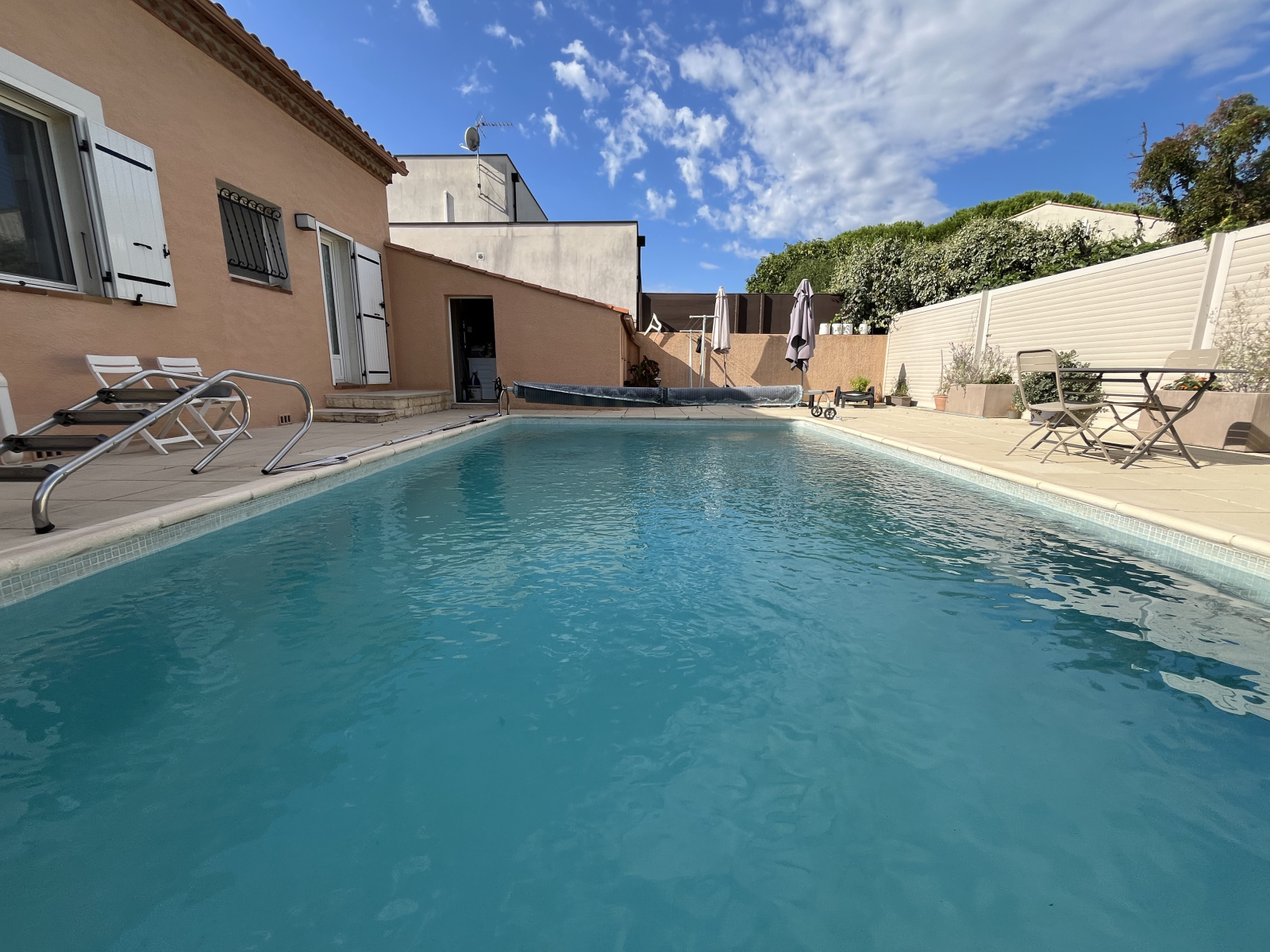 Grande terrasse de 124 m² autour de la piscine : véritable espace de réception, parfait pour accueillir famille et amis.