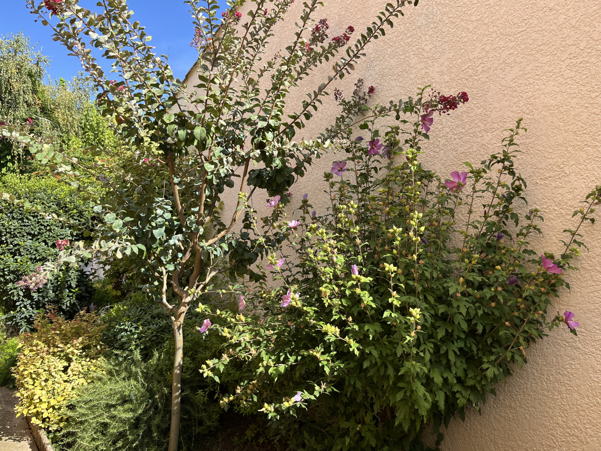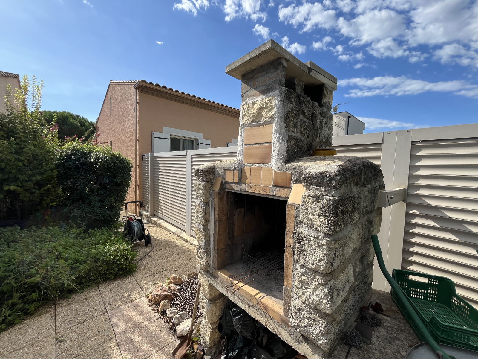 Jardin arboré avec espaces potager et barbecue.