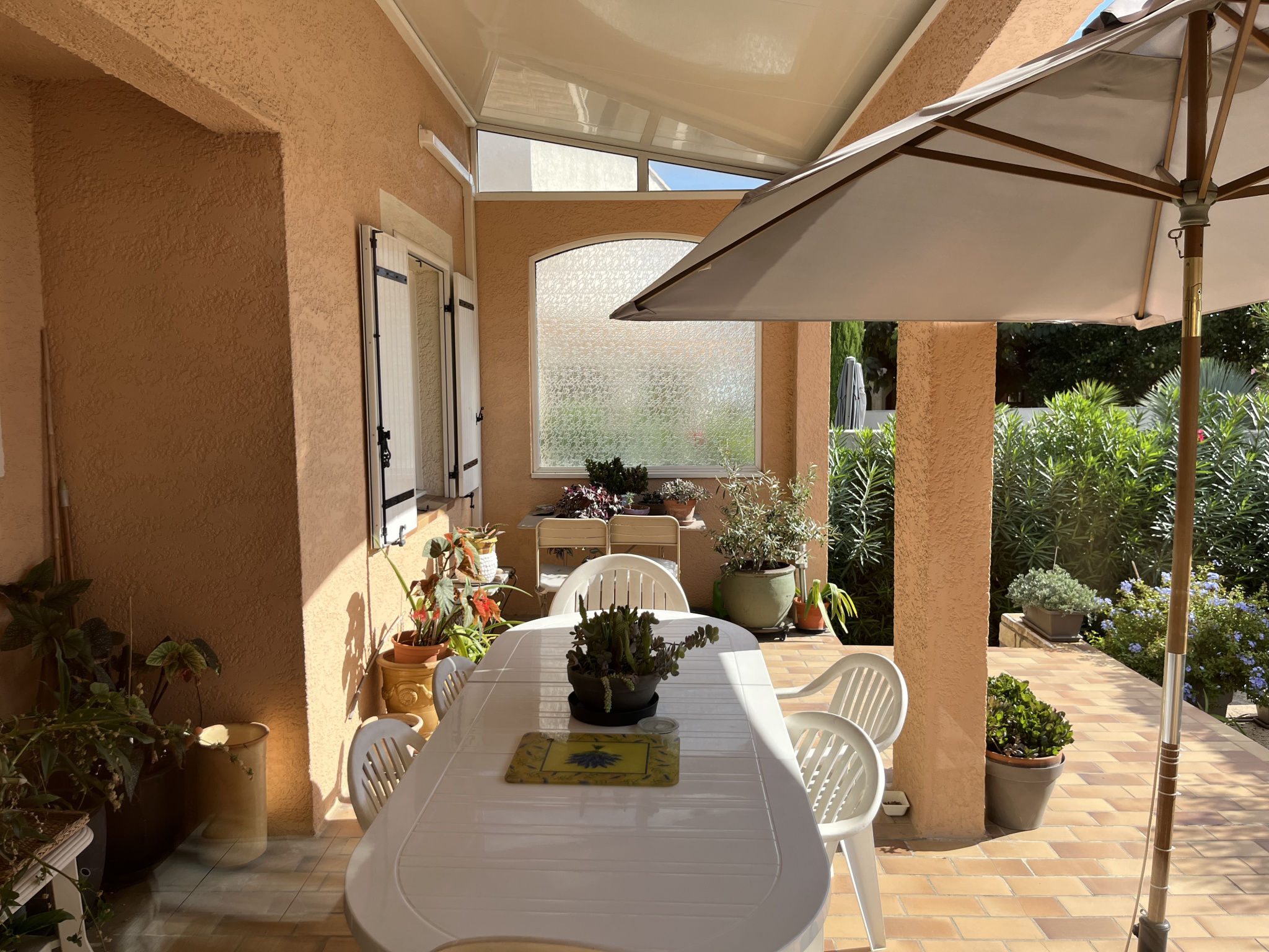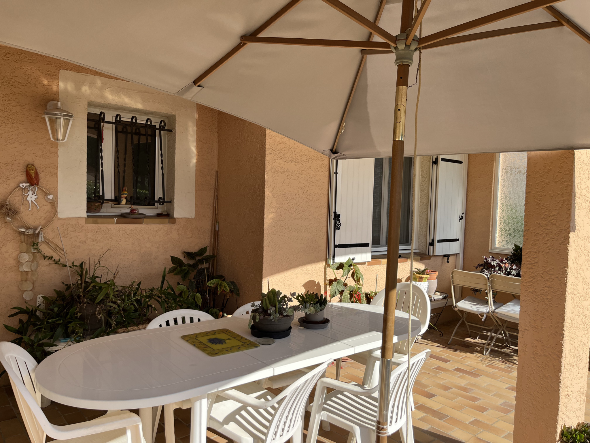 Terrasse côté Est de 30 m², idéale pour les petits-déjeuners au soleil et offrant la possibilité de créer une véranda ou une pièce supplémentaire.
