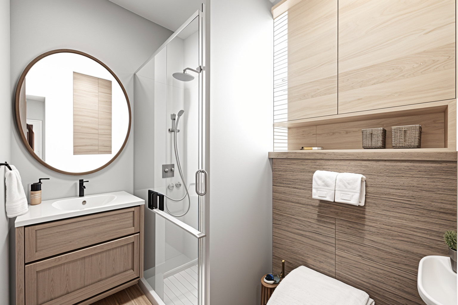 - Plan 3D : meubles optimisés, lit escamotable, kitchenette moderne, style méditerranéen chaleureux