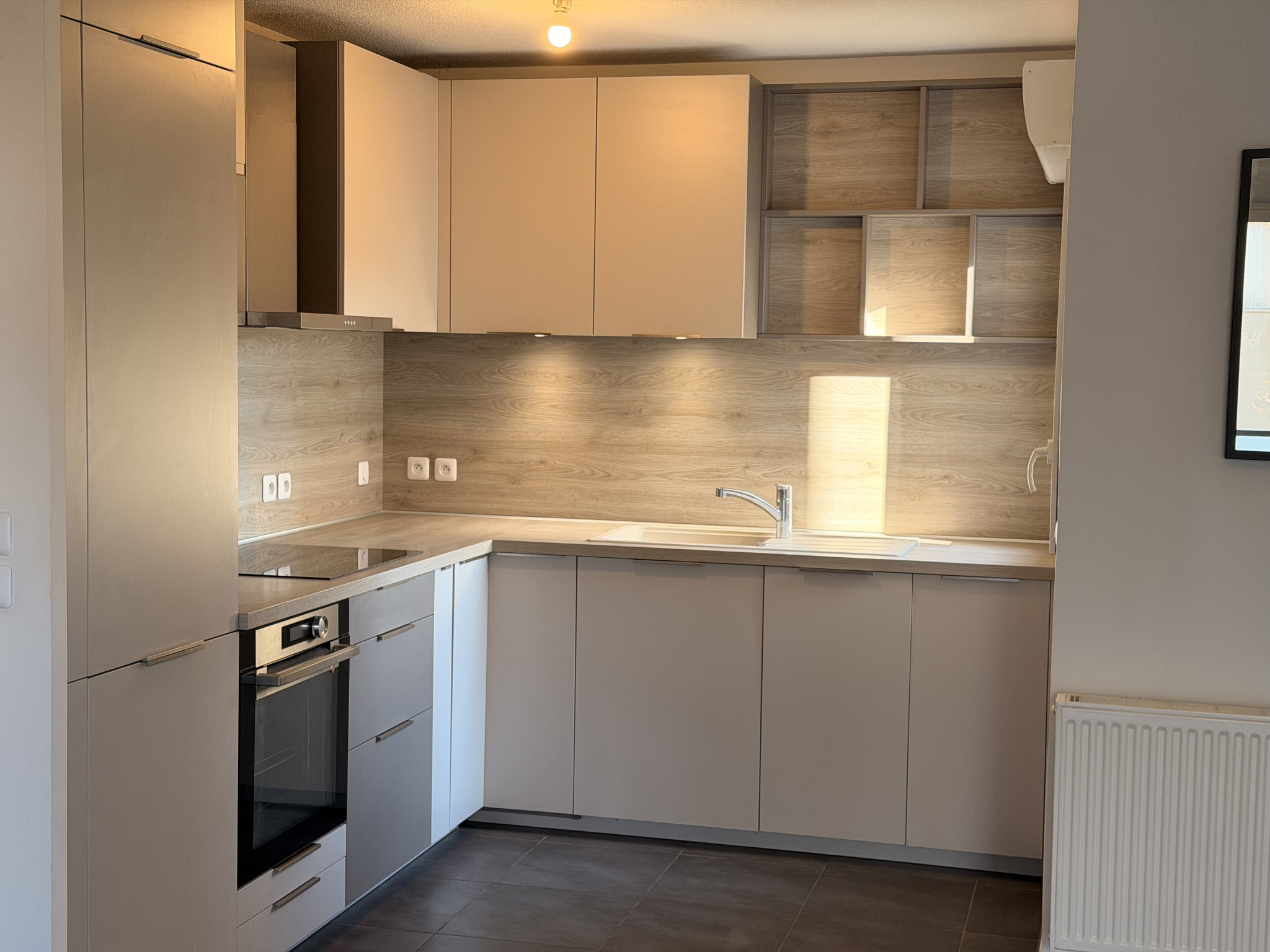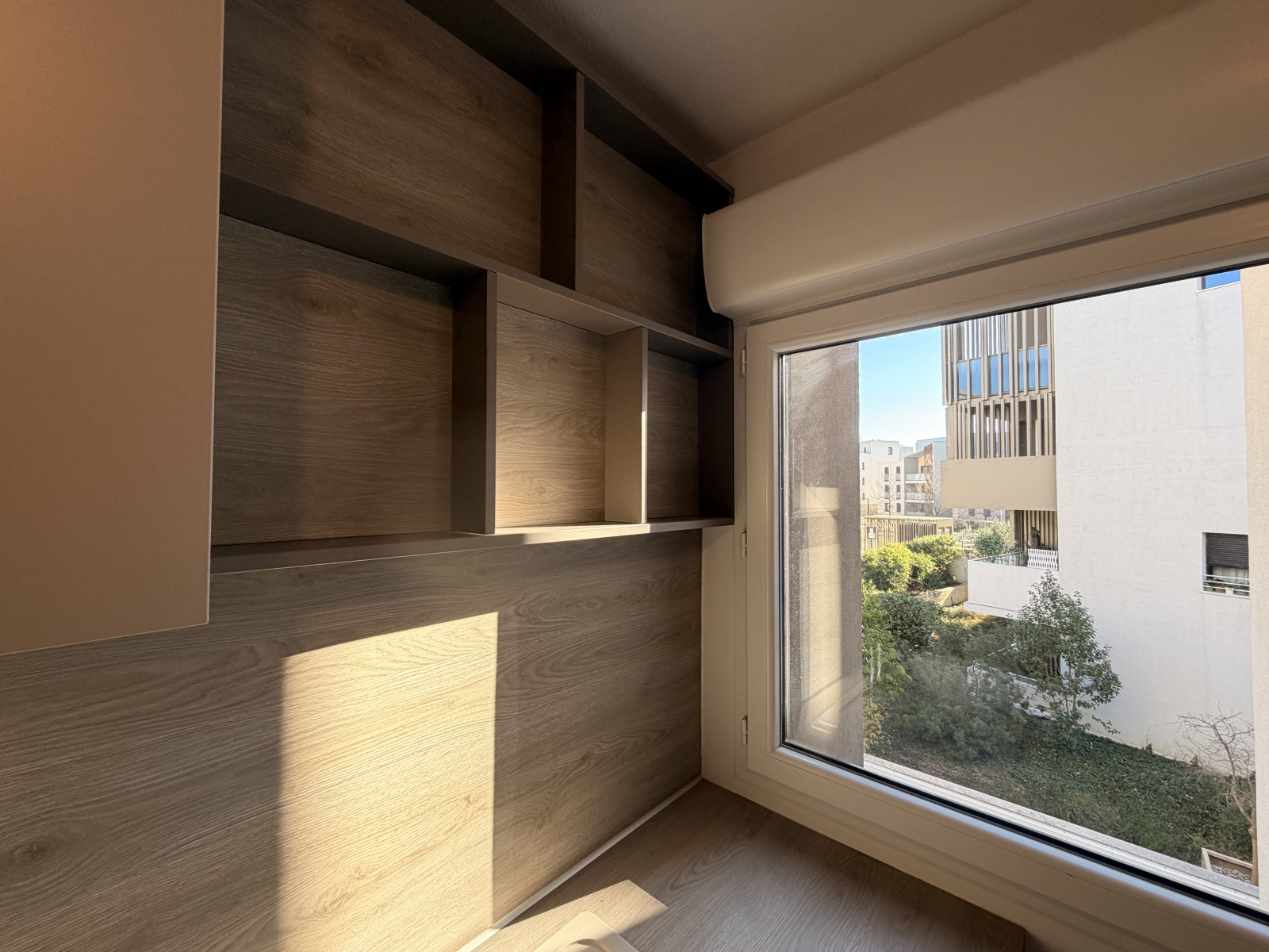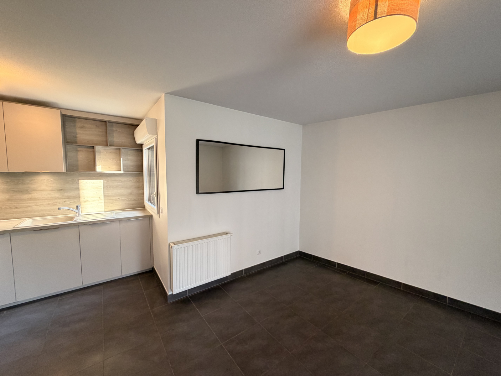 Situé au 1er étage, l’appartement propose une pièce de vie de près de 24 m² baignée de lumière, avec cuisine entièrement aménagée et équipée.